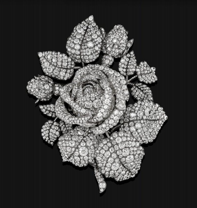 This was the Gilded Age, and royal jewels were now worn by the new powerbrokers with names like Vanderbilt and Astor and Rockefeller. One exquisite piece in this exhibition is a corsage brooch created by Mellerio dits Meller in 1864 for Princess Mathilde Bonaparte, a cousin of Napoleon III. Emma calls it ‘a study in naturalism’, a fully bloomed rose set with 2,309 diamonds. The princess, known for her beauty, wore it when hosting salons for Paris’s literary and artistic elite. After her death in 1904, it was sold to Mrs Cornelius Vanderbilt III, who showed it off at high-society parties in New York.