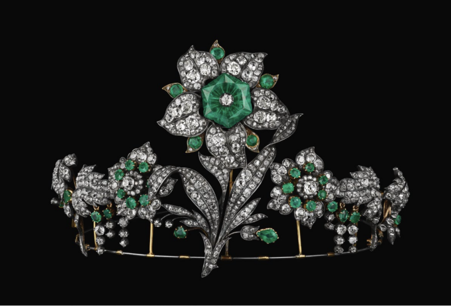 Another highlight is the simple sapphire and diamond coronet that Prince Albert designed for Queen Victoria in 1840, their wedding year. She wore it in her first official portrait, and copies of the painting were given as gifts around the Empire. The beloved piece is shown next to her emerald-and-diamond tiara, also designed by her regent and realised by Joseph Kitching. As both were passed down to other family members, Emma says, ‘you can speculate that they might have been worn together at fabulous house parties, but they haven’t been seen together for a very long time’.